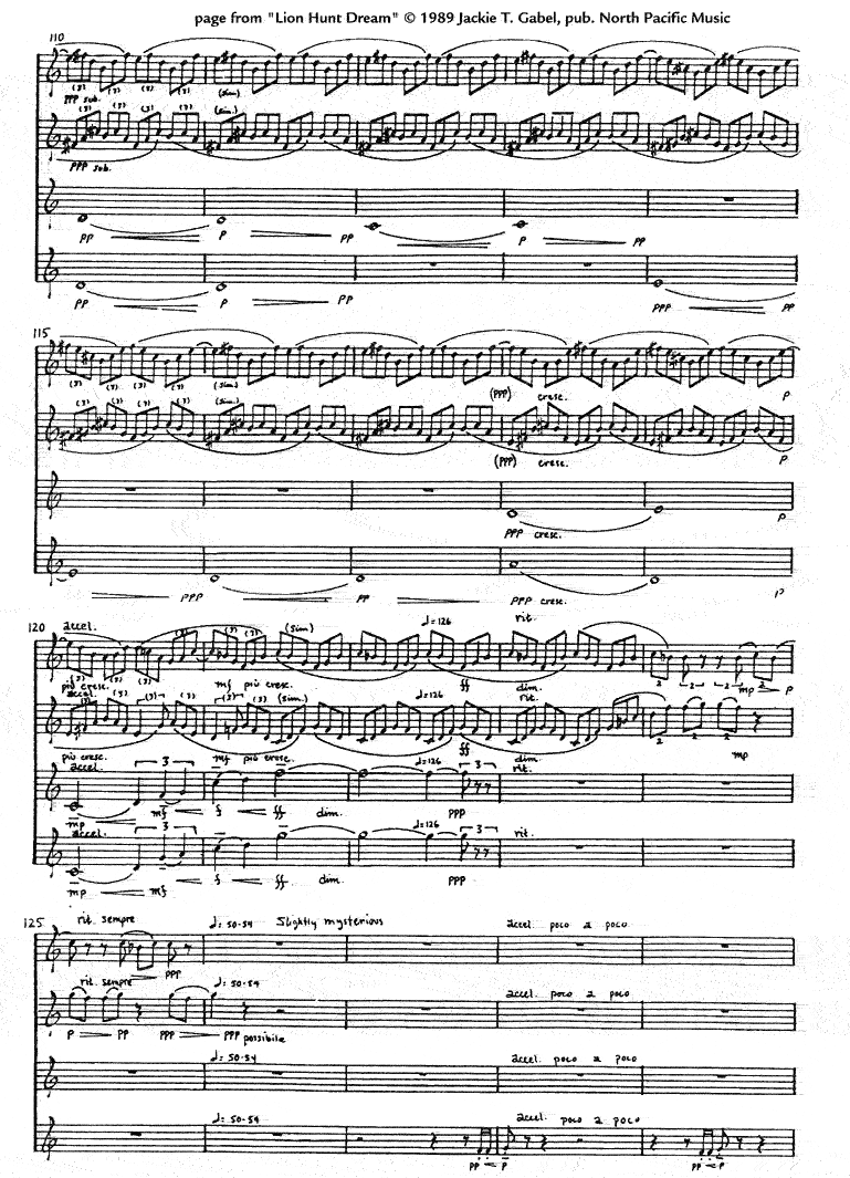 Though classically trained with composers Derek Healey, Tomas Svoboda and poet Ralph Salisbury, Gabel recounts as his most memorable musical experience, the impromptu jam session he had with an Afghan tribesman in a Herat tea house in 1972 -- the composer on mouth organ and the local talent holding forth on his handmade, rough-hewn, 3-string lute. The two miraculously found a common modality straight away and carried on for several hours. "No concert-hall premiere or recording session can to date compare," adds the composer, "nor likely ever will."